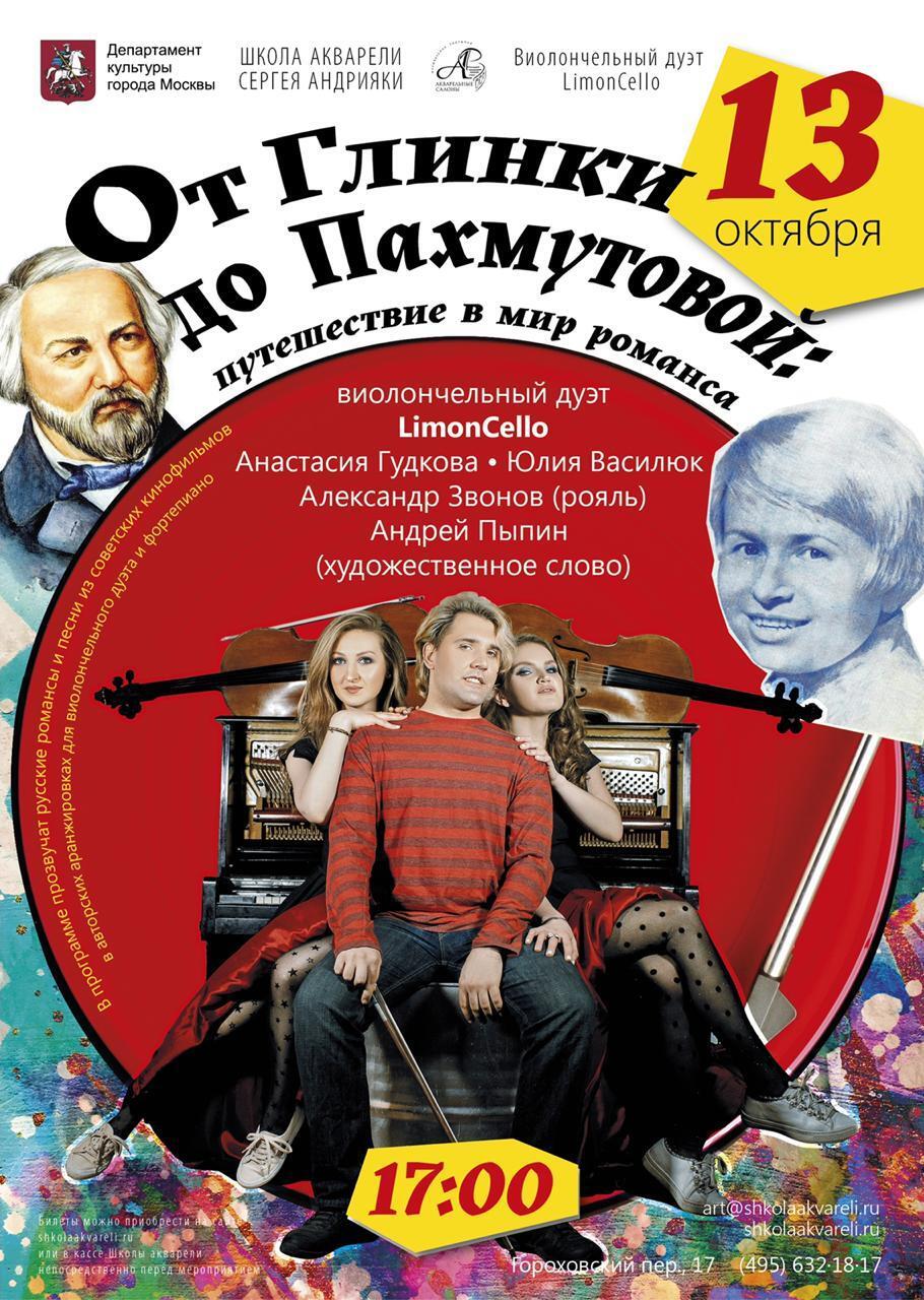 Музыкальным центром концерта станет знаменитое фортепианное танго Игоря Стравинского, переложение которого было сделано специально для группы Limoncello, выступившие с этим произведением для арт-фестиваля в честь 135-летия со дня рождения композитора.В программе вечера вы услышите русские романсы и песни из советских кинофильмов, а также произведения М. Глинки, С. Рахманинова, Г. Дегтярёва, А. Пахмутовой, Г. Пономаренко, И. Шатрова, П. Булахова, Э. Сантеухини, Яна Френкеля и Льва Книппера, в авторских аранжировках для виолончельного дуэта и фортепиано.