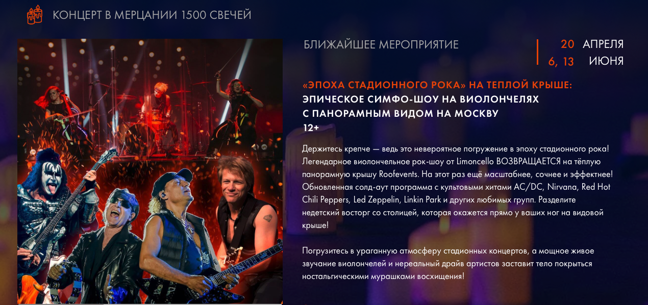 «ЭПОХА СТАДИОННОГО РОКА» НА ТЕПЛОЙ КРЫШЕ: ЭПИЧЕСКОЕ СИМФО-ШОУ НА ВИОЛОНЧЕЛЯХ С ПАНОРАМНЫМ ВИДОМ НА МОСКВУ 20 апреля. 6 июня. 13 июня 2025