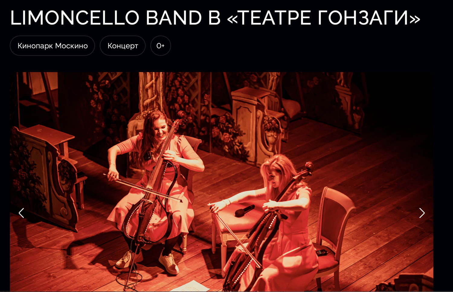 ЯРКИЕ ВЫСТУПЛЕНИЯ НЕОБЫЧНОГО ДУЭТА Limoncello band – музыкальный эксперимент, который покорит слушателей и зарядит вас энергией. Оригинальные аранжировки и обаяние этих девушек не оставят равнодушным никого. Две виолончели создают эффект абсолютной гармонии, сочетающий ритмику и виртуозную технику владения инструментами. Академическое образование и уникальная харизма участниц превращают каждое выступление в стиле виолончельного рока в настоящее волшебство.Выступления:5 июля «Центральная площадь»12:30 – 13:0014:30 – 15:006 июля «Театр Гонзаги»13:00 – 13:30 15:30 – 16:00 0+ Вход свободный при наличии билета на «Киновыходные».