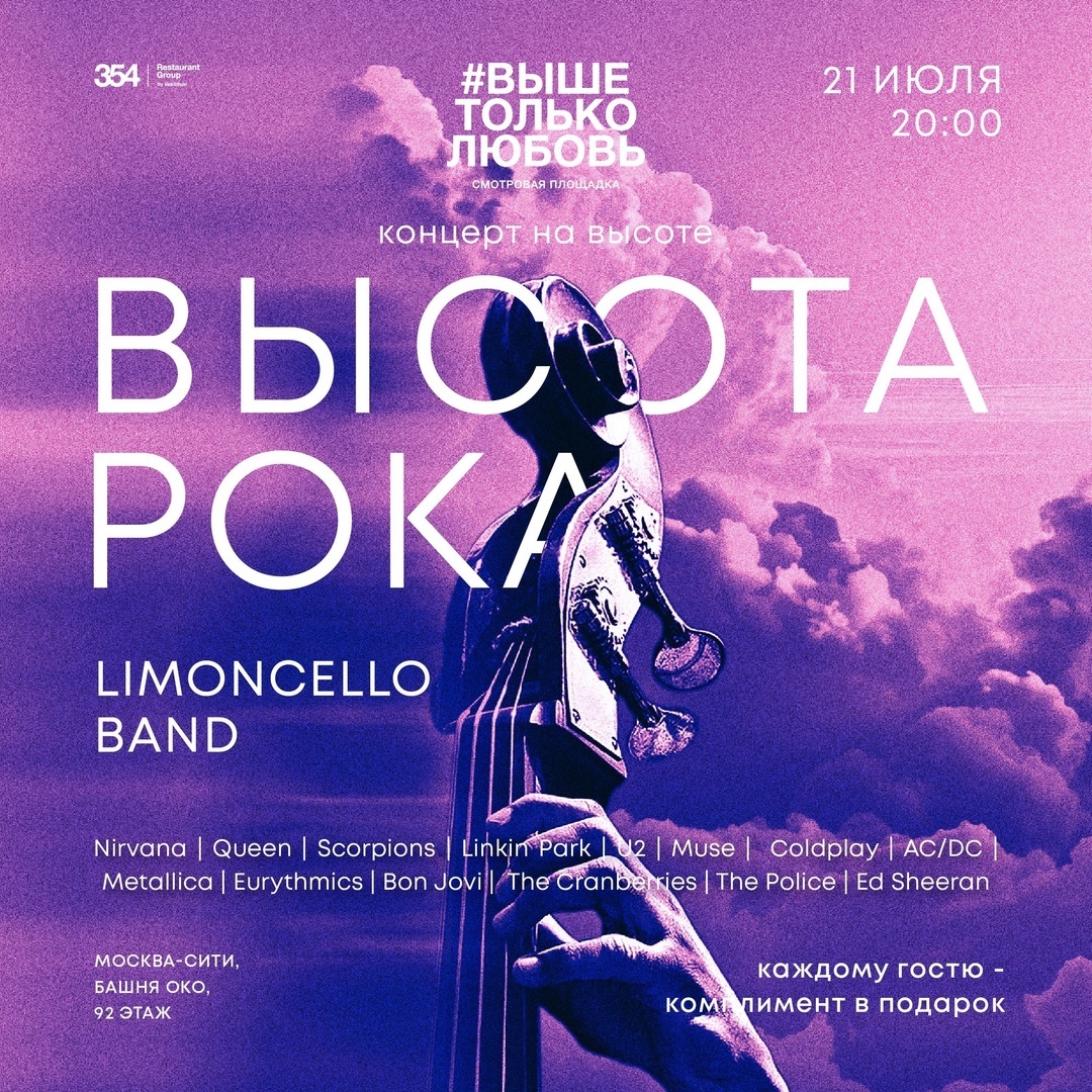Выступление кроссовер группы Limoncello band - это всегда заряд энергии, в независимости от программы. Оригинальные аранжировки и обаяние этих девушек никого не оставит равнодушным ! В программе "Высота Рока", которую вы услышите на потрясающе красивой площадке #ВышеТолькоЛюбовь прозвучат всеми любимые песни Nirvana, Queen, Scorpions, Linkin Park, U2, Muse, Coldplay, AC/DC, Metallica, Eurythmics, Bon Jovi, The Cranberries, The Police, Ed Sheeran и др.Две виолончели - фантастическое сочетания тяжелого грува и виртуозной техники с тягучим, загадочным низким тембром классического струнного инструмента, неожиданно создают эффект абсолютной совместимости !Виолончельный рок стал самостоятельным жанром с появлением таких групп как Apocalyptica и 2cellos, а теперь группа такого уровня есть и у нас, в России.Музыкальная программа Limoncello – это проекция классического французского виолончельного дуэта на современную рок музыку. Это именно то, что может дать серьезное академическое образование в тандеме с любовью к классическому року.Комплемент от бармена в подарок!Площадка под открытым небом, формат - без посадочных мест. Продолжительность программы - 60 мин.ВЫШЕ ТОЛЬКО ЛЮБОВЬ92 этаж, Башня ОКО